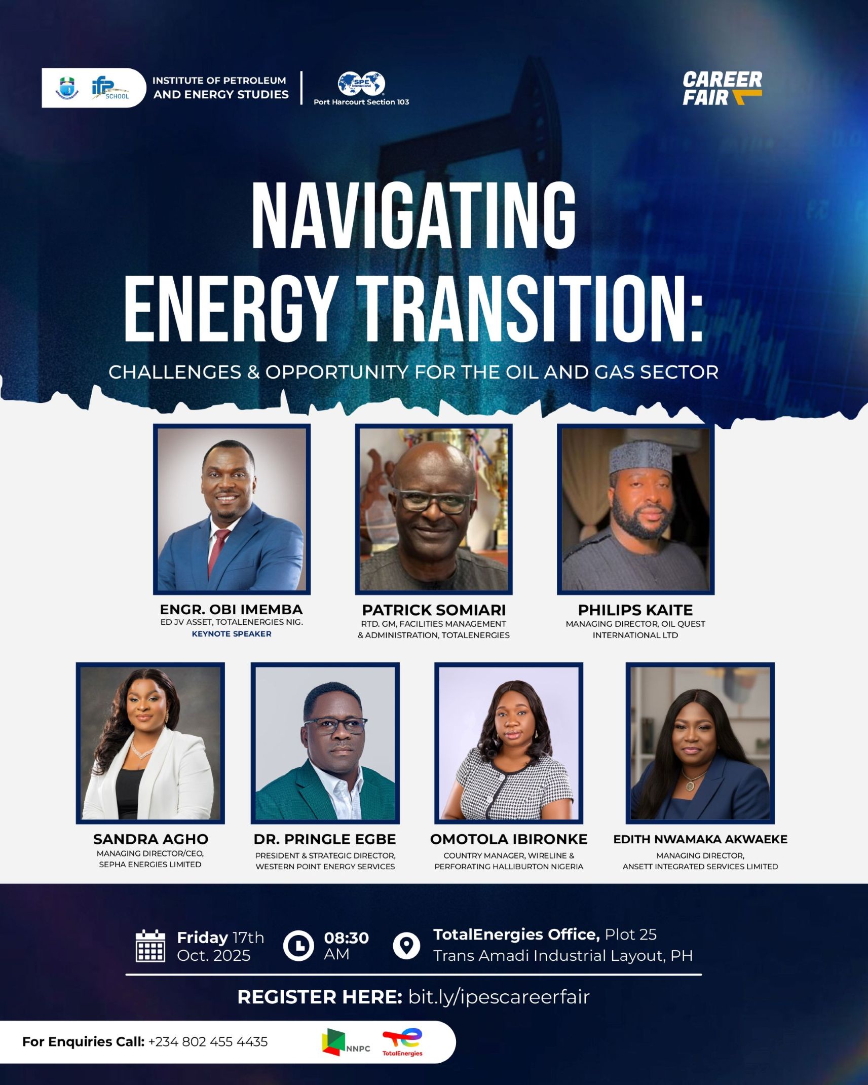 The Institute of Petroleum and Energy Studies (IPES) Uniport, in partnership with the SPE SECTION 103, invites you to our 2025 Career Fair with the theme - Navigating Energy Transition: Challenges & Opportunities for the Oil and Gas Sector.